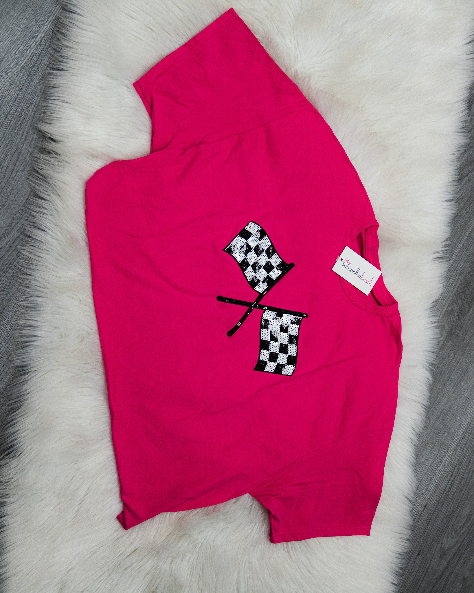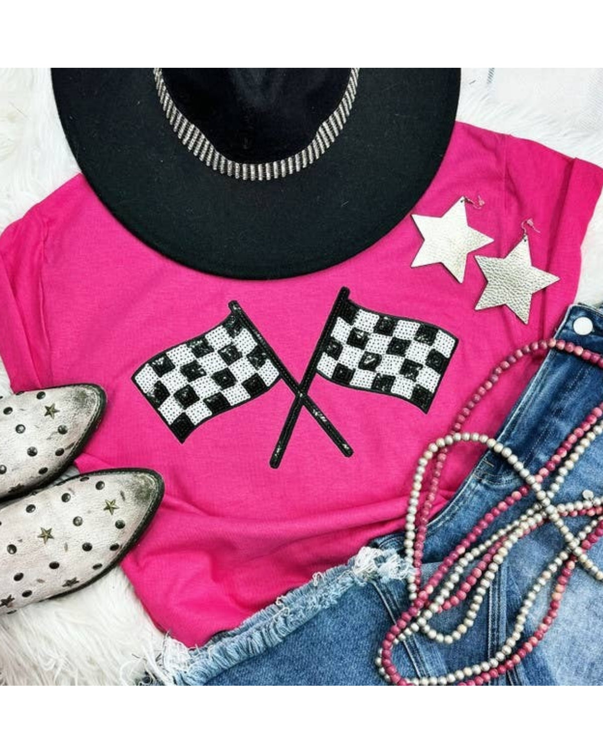 Wave the flags high in the Double Victory Tee — a bold, racing-inspired graphic tee that’s all about celebrating your wins in style. Featuring two checkered flags across the front, this tee gives off that fierce, feminine race-day energy we love.