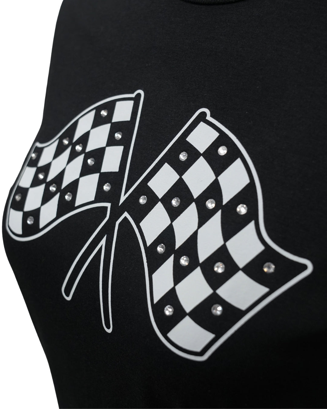 Start race day in the Pole Position Tee — the ultimate staple for every motorsports fan. Featuring two crossed checkered flags on a sleek black backdrop, this graphic tee delivers bold racing energy with a clean, elevated edge. Subtle rhinestone stud detailing throughout the flags adds the perfect touch of dimension and standout style.
