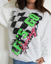 This vintage-inspired Race Day graphic brings bold energy with hot pink and lime green accents over a checkered splatter paint base. Designed for an effortlessly cool look, this graphic is printed on a classic white unisex crewneck sweatshirt that fits true to size. Perfect for race day or everyday wear, this piece is a must-have for any racing fan!