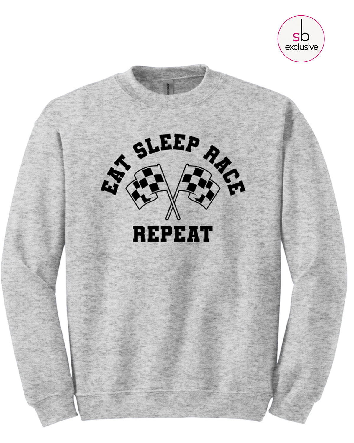 - "Eat,Sleep,Race,Repeat" with checkered flag graphic on front.