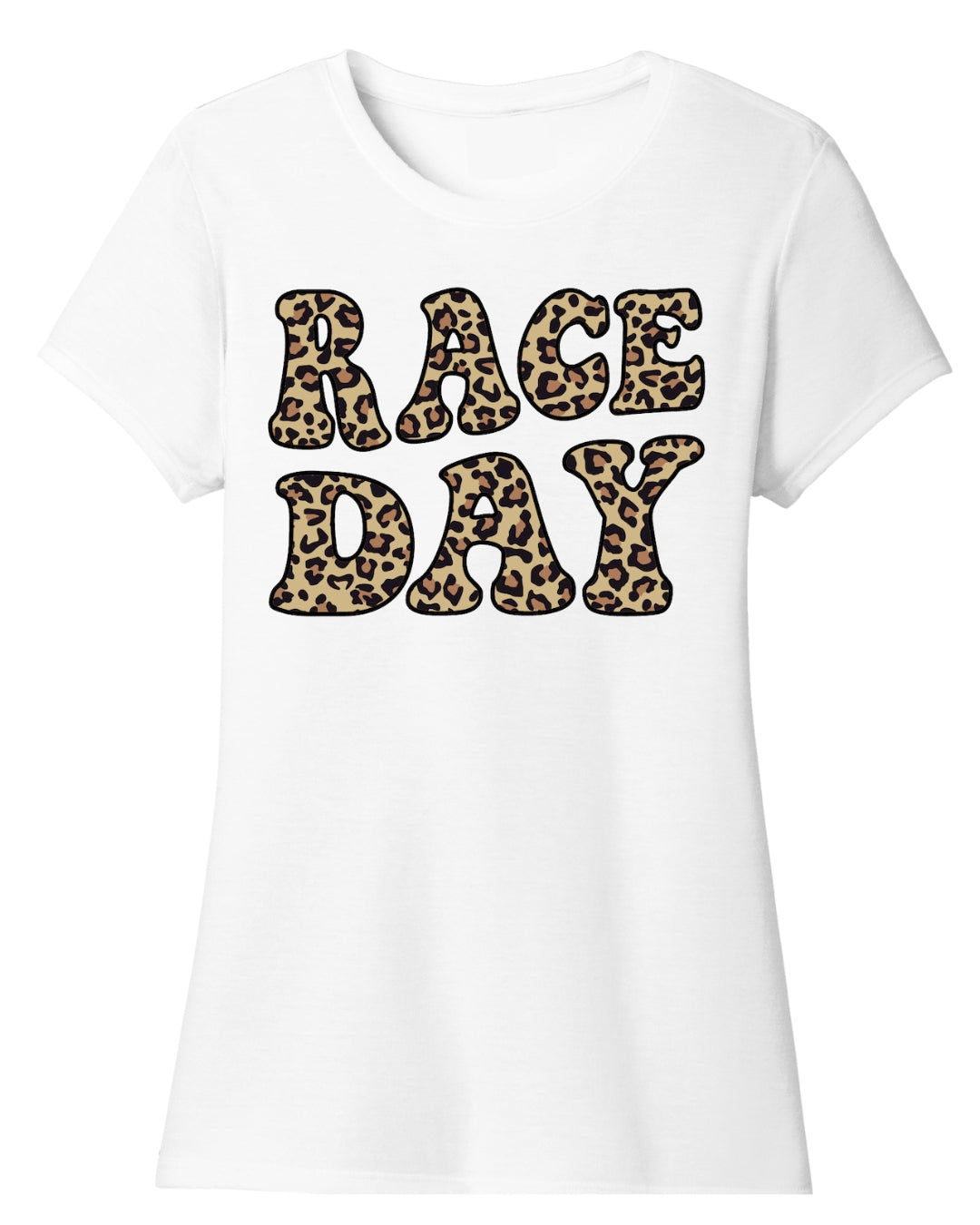 Inspired by our Getting Rowdy tees, this design is made for the chic, trendy race fan! Featuring "Race Day" in bold leopard print across the front, this tee brings a stylish edge to classic race day fashion. Designed on a white, short-sleeve crewneck, this unisex tee fits true to size for a comfortable yet statement-making look