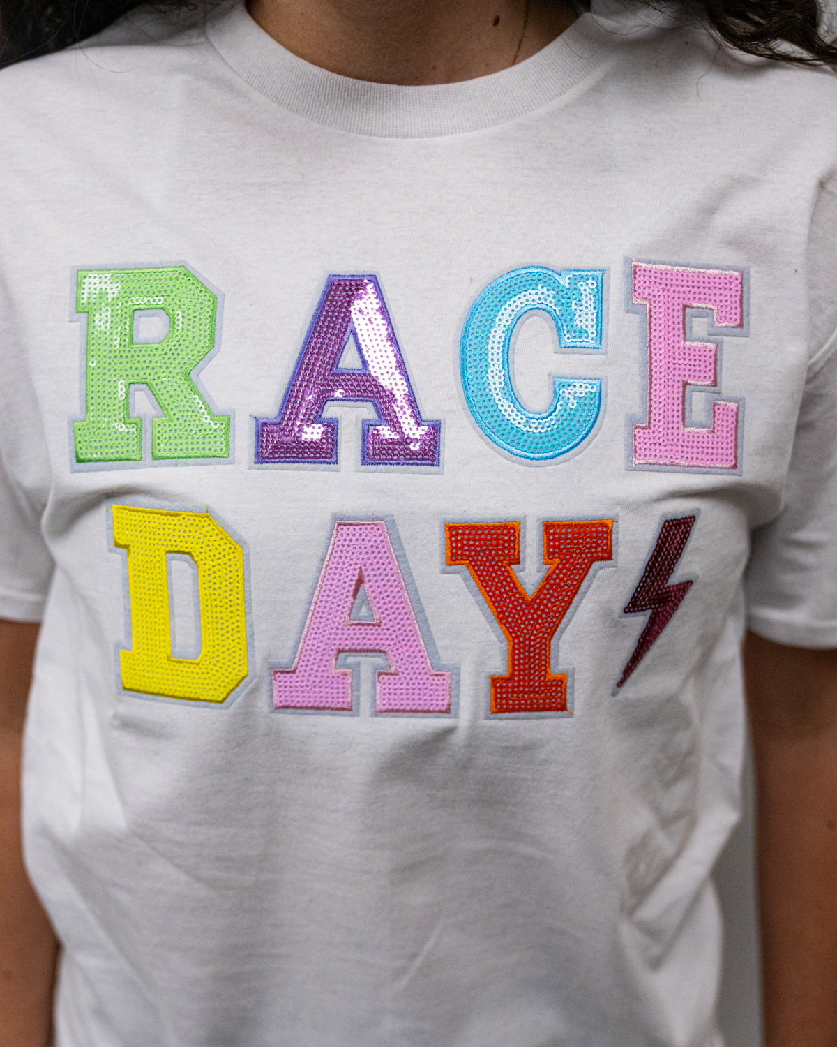 Get ready to shine on race day with our Race Day Sequin Letter Top! This white short-sleeve tee features a classic crew neckline and bold, multicolored sequin letters that add the perfect touch of sparkle.